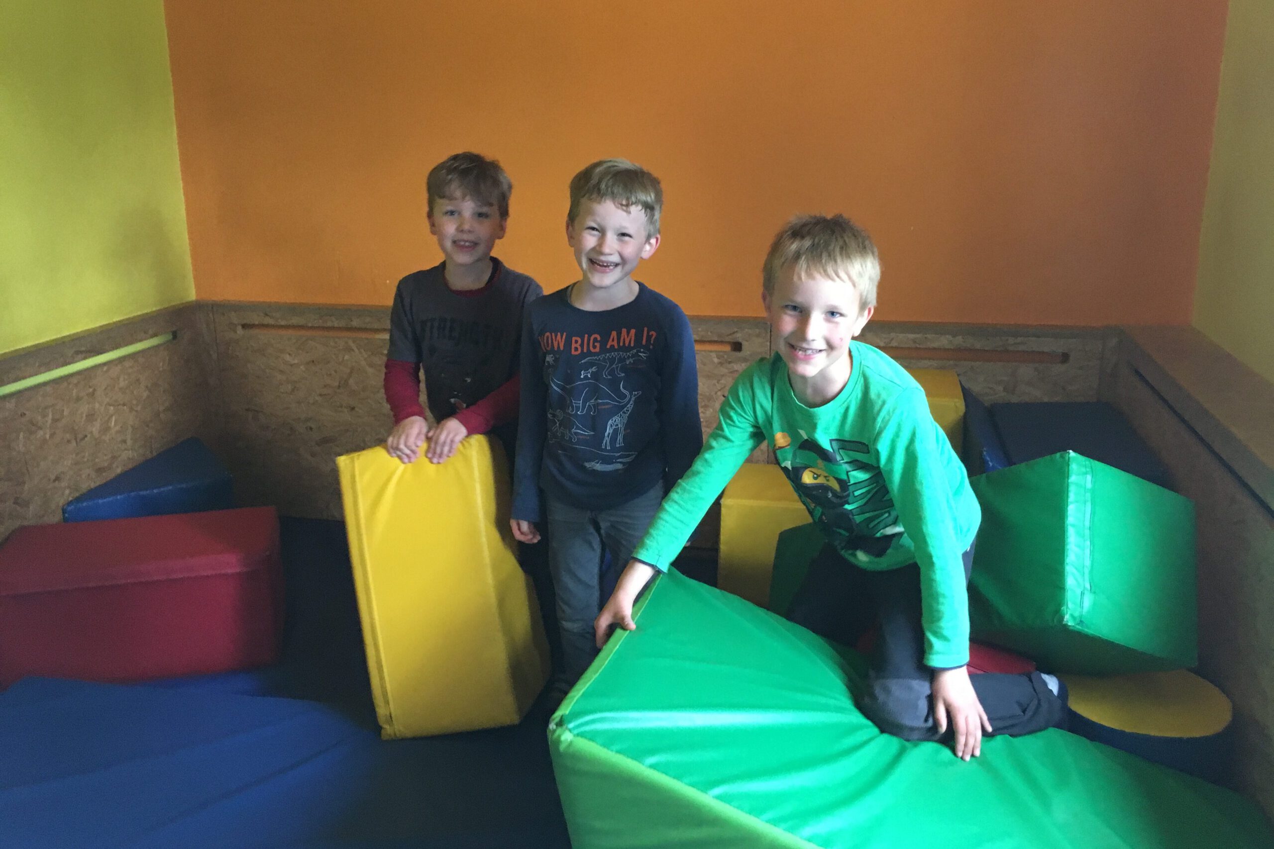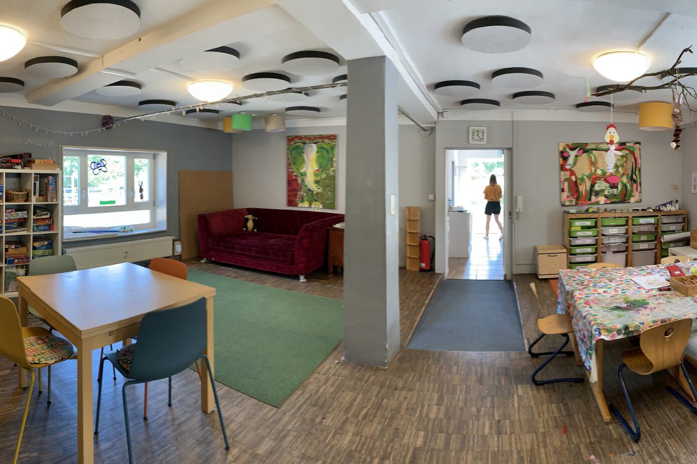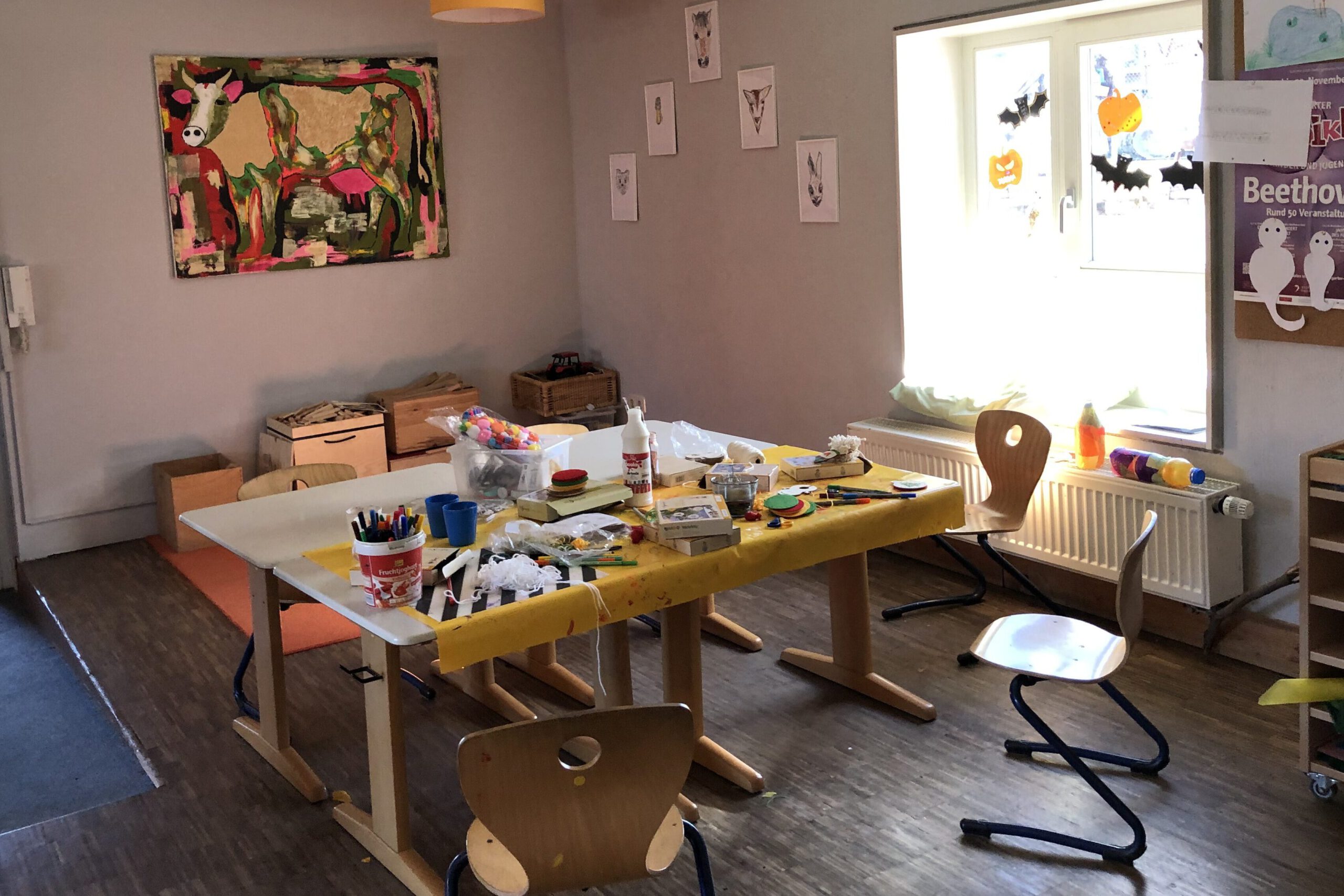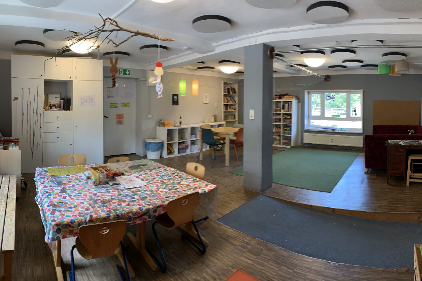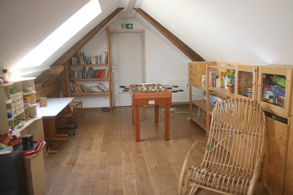 Wir nutzen einen großzügigen Aufenthaltsraum mit verschiedenen Spiel- und Bauecken, einem gemütlichen Lese- und Lümmelsofa sowie einem Kreativtisch zum Malen und Basteln. Für ausgelassenes Spielen steht ein Toberaum mit Matten und Kissen zur Verfügung. Einen ruhigen und konzentrierten Rahmen für die Hausaufgaben bietet das Hausaufgabenzimmer im Dachgeschoss.